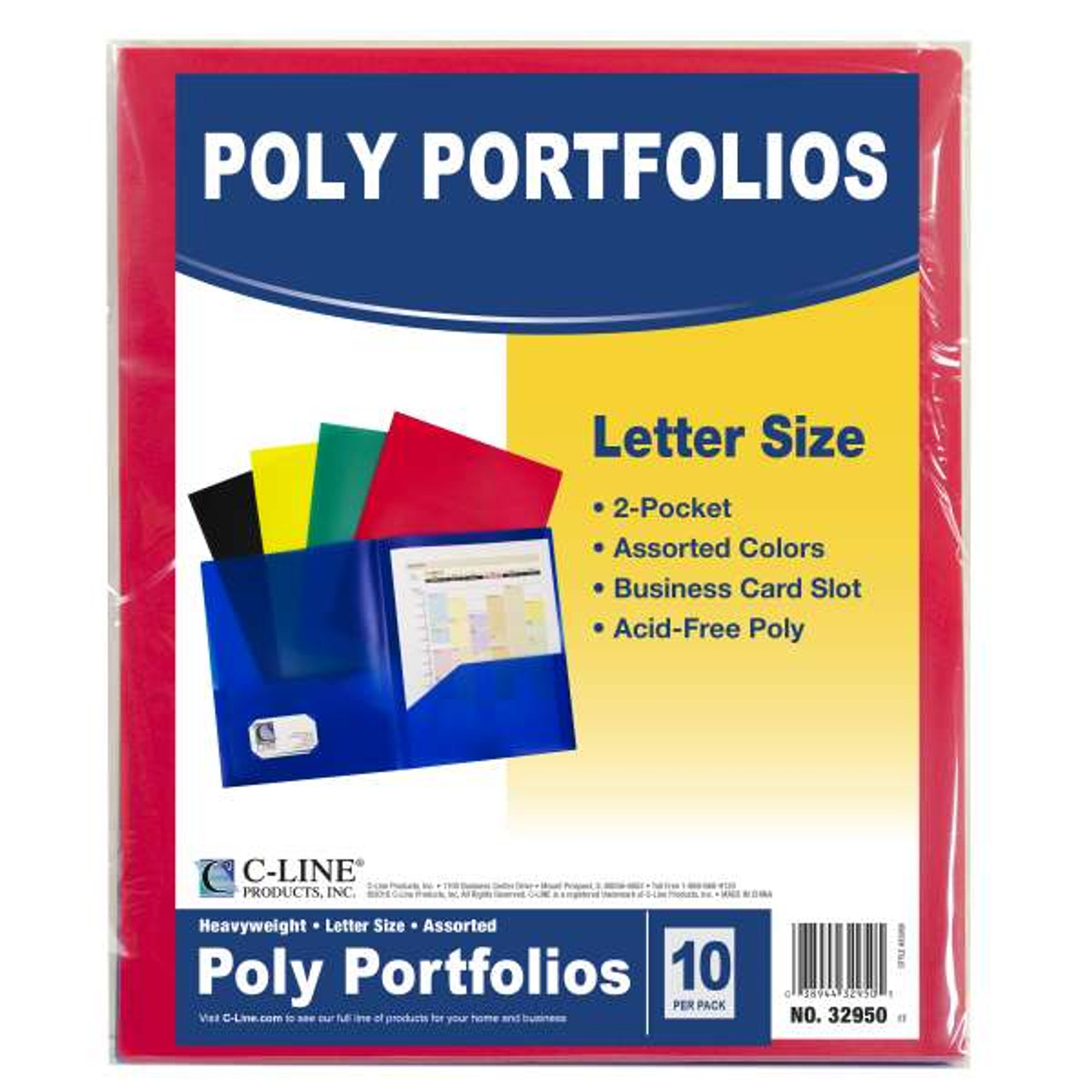 Ideal for classroom and office settings, two-pocket folders are an essential presentation and document storage item. Keep track of 8-1/2 x 11 size documents by organizing them in these durable portfolios. Two-pocket heavyweight polypropylene folders hold papers and resist tearing. Features business card slot. Without prongs. The vibrant colors help identify and differentiate information being stored for a particular class or project. Assortment includes 2 each of red, yellow, green, blue, and black. 10/PK