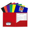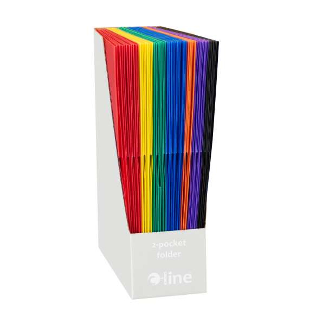 Two-pocket heavyweight polypropylene portfolios/folders hold papers and resist tearing. Features business card slot. Without prongs. Assorted primary colors include red, orange, yellow, green, blue, purple, and black. The minimum purchase quantity is 36 units (one display).