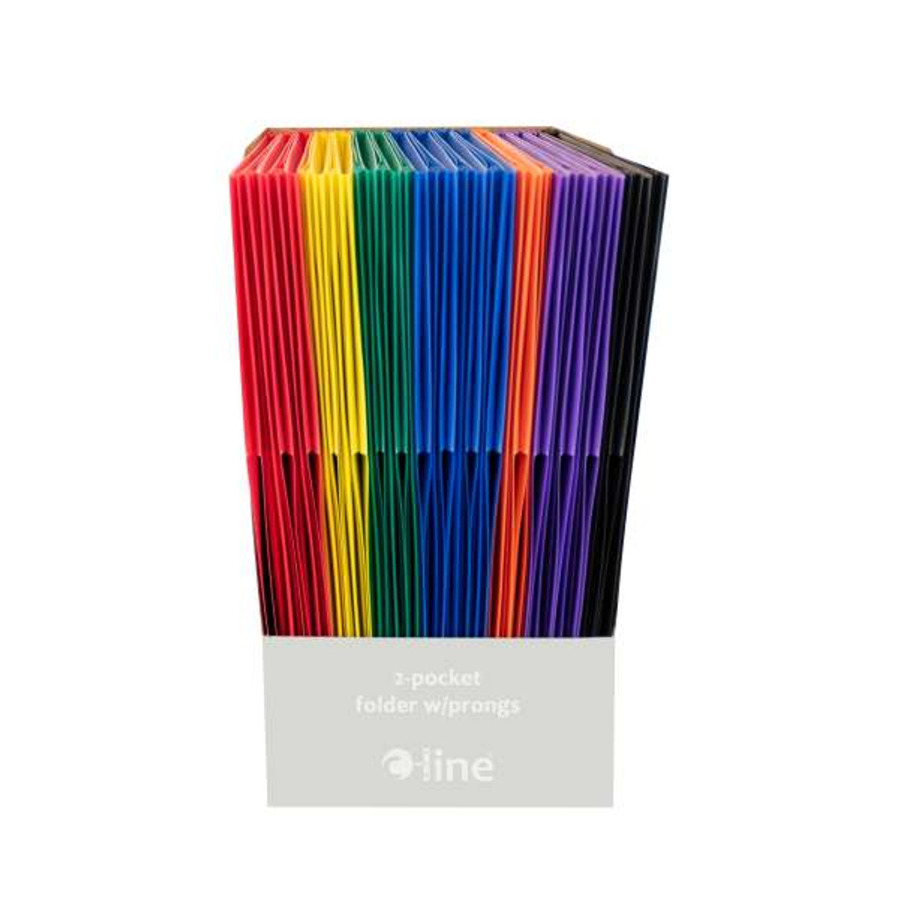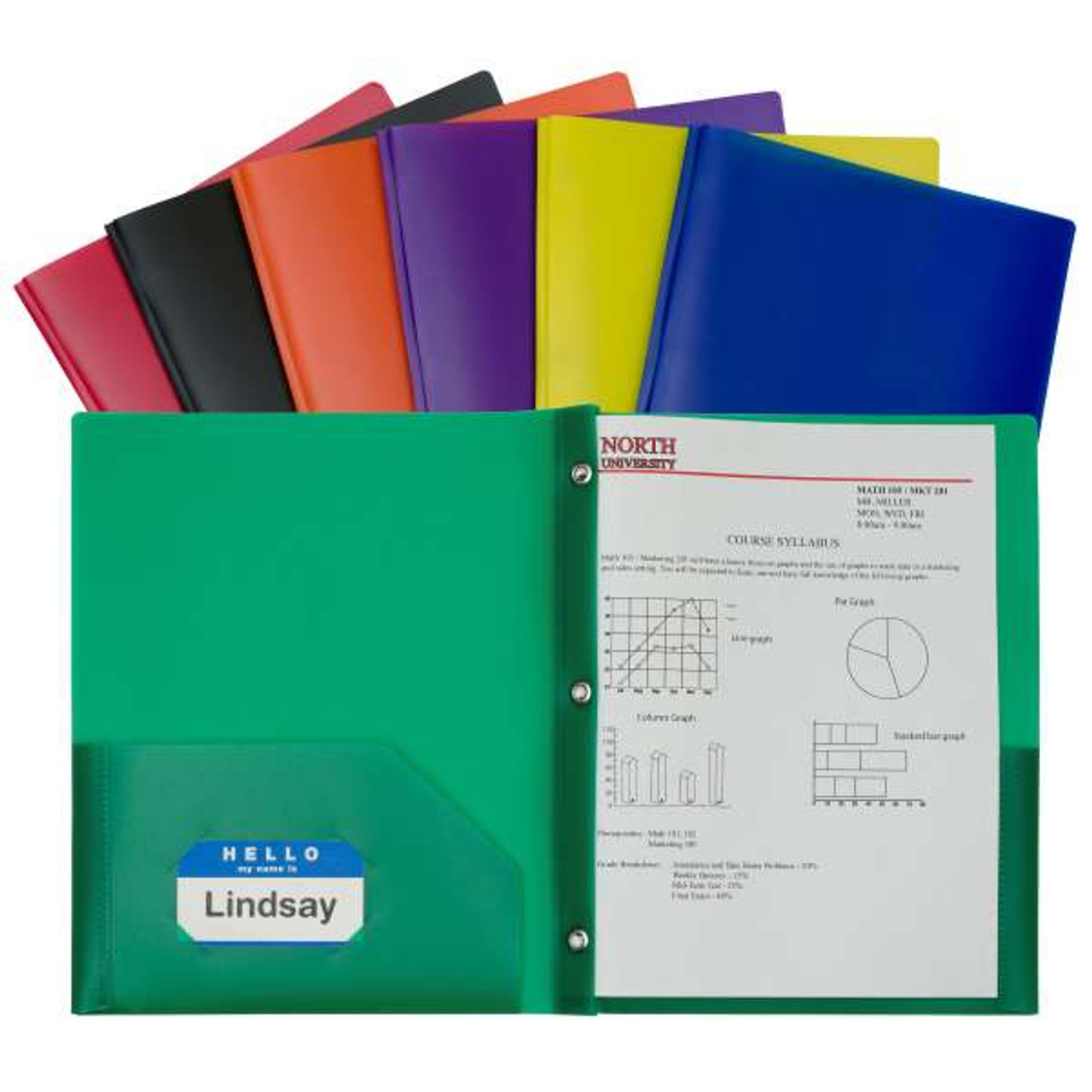 Two-pocket heavyweight polypropylene portfolios/folders hold papers and resist tearing. Features business card slot. With prongs. Assorted primary colors include red, orange, yellow, green, blue, purple, and black.
