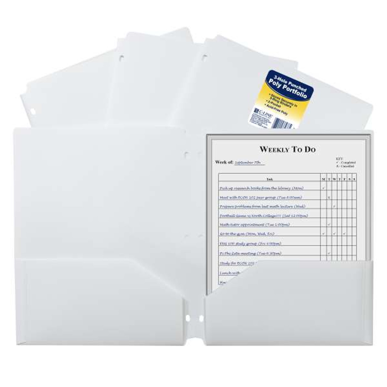Need some help keeping your three-ring binder in order? With the help of these specialty two-pocket folders, letter-size papers can stay organized, while still remaining accessible. Two-pocket heavyweight polypropylene portfolios/folders with three-hole punch hold papers and resist tearing. Features three-hole punching for secure storage in standard 3-ring binders. Cut-outs at the top and bottom keep the portfolio from being caught in the binder open-close mechanism. White. 25 EA/BX.