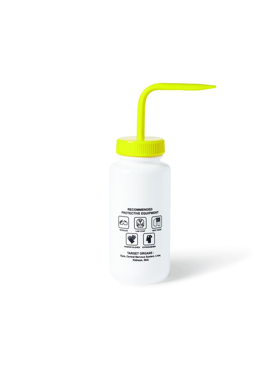 United Scientific™ UniSafe™ vented wash bottles are made from industrial grade low-density polyethylene with polypropylene stem closure and venting assembly. They are pre-printed with the Chemical name and formula, the National Fire Protection Association (NFPA) Section 704 Four-color Diamond, health hazards, Chemical Abstract System (CAS) number, and suggested protective clothing and equipment. Each bottle is compliant with GHS and OSHA requirements outlined in Hazard Communication Standard 29 CFR 1910.1200. Intended for use only with LDPE and PP compatible solvents.
