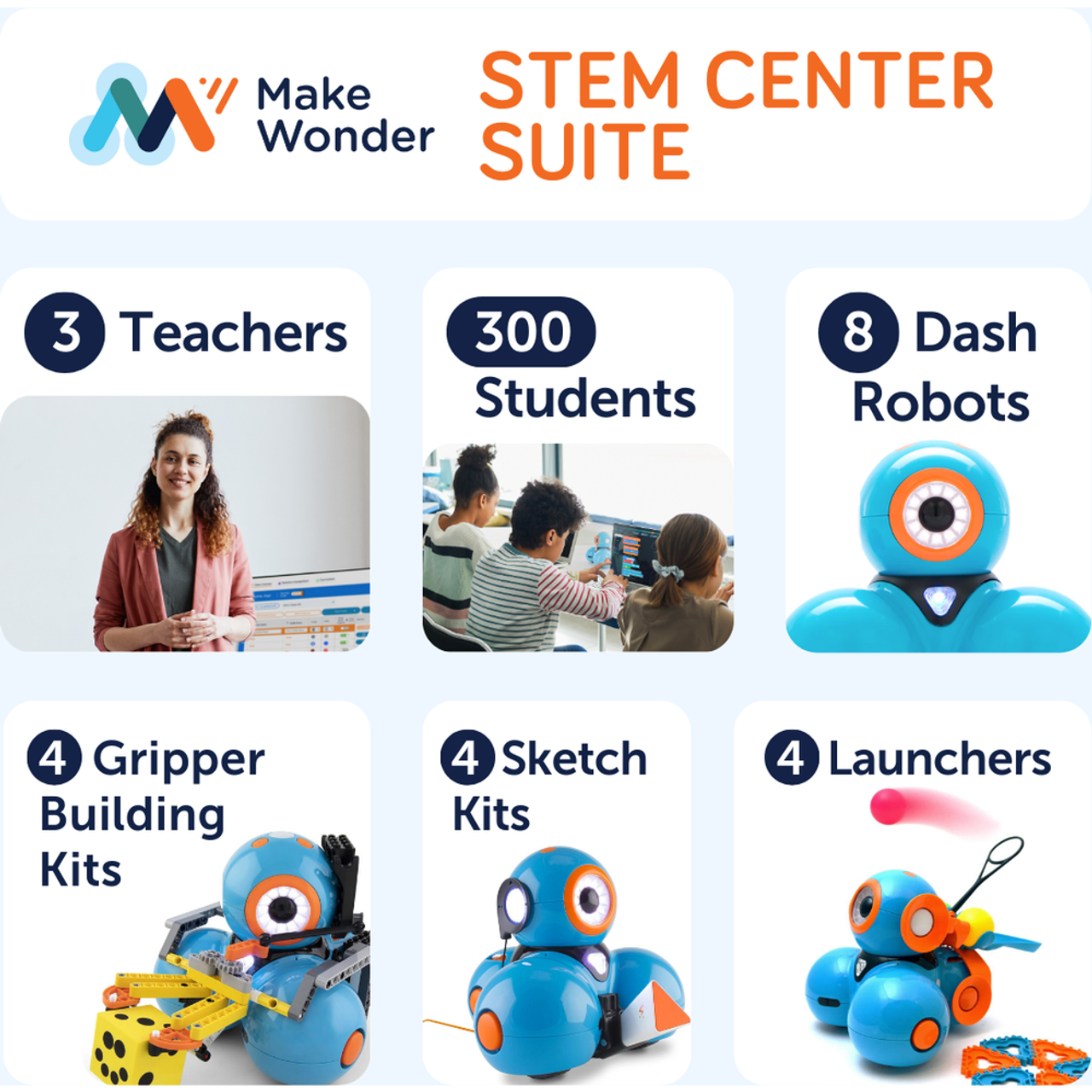 The Make Wonder STEM Center Suite combines the power of the Make Wonder platform with the irresistible charm of 8 Dash robots and the flexibility of our complete set of accessories (4 Gripper Building Kits, 4 Sketch Kits, and 4 Launchers). Make Wonder STEM Center provides a license for 300 students and 3 teachers. Need to add more students? Shop our 100-student add-on packs. Hardware Included: 8 Dash robots, 4 Gripper Building Kits, 4 Sketch Kits, 4 Launch, 16 Building Brick Connectors. Make Wonder STEM Center Features: 300 student accounts so students can preserve their own progress through puzzles and activities. Progress tracking and classroom management for 3 teachers.