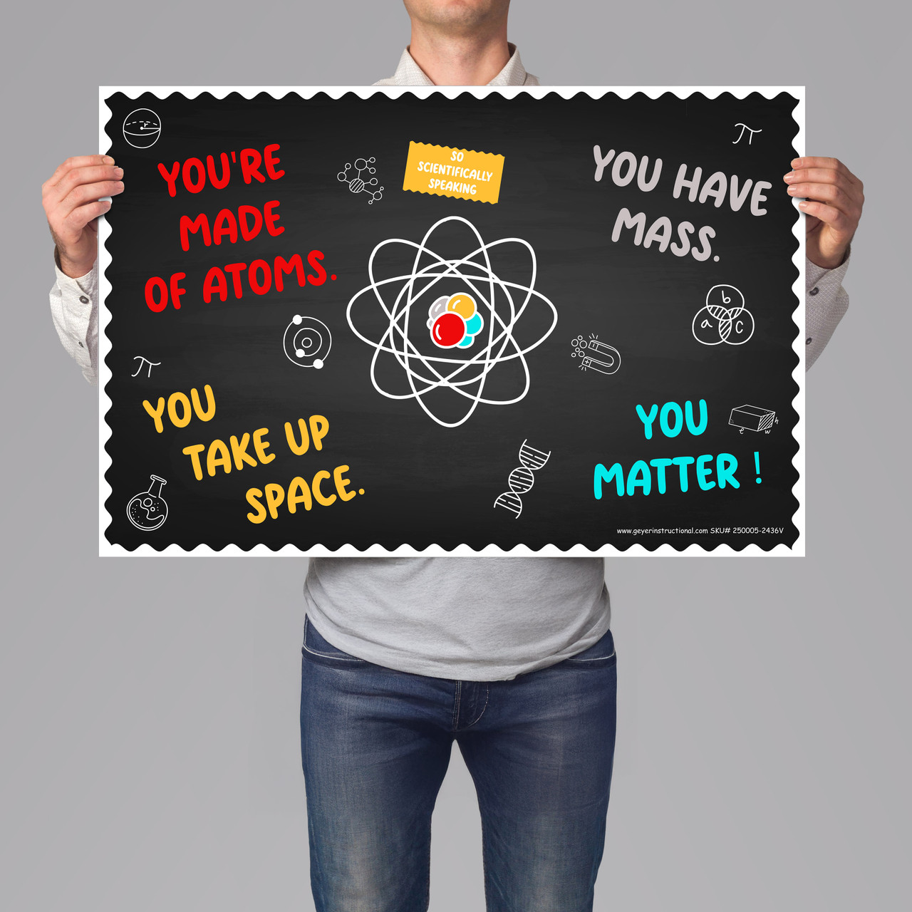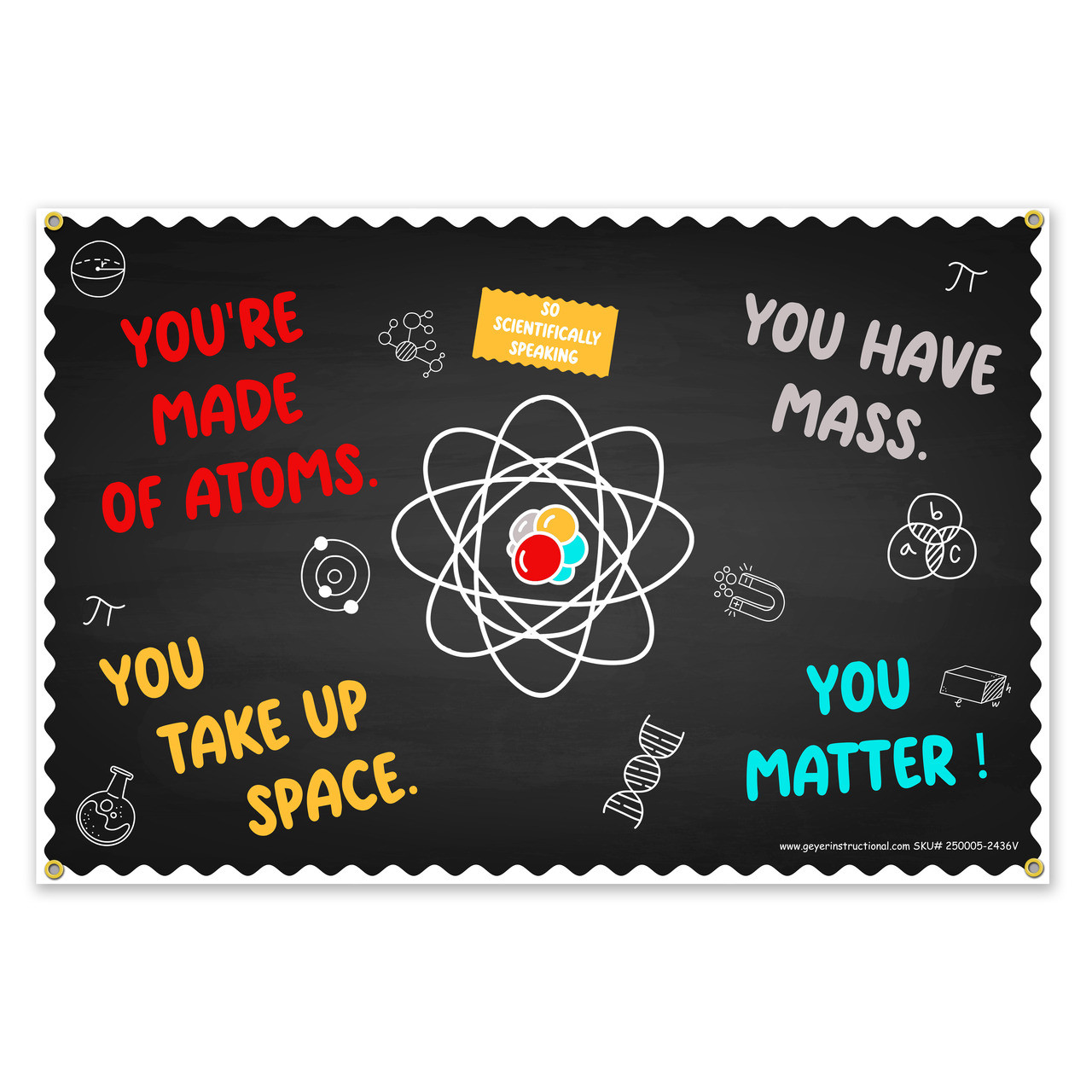Inspire your students with the You MATTER Science Poster, printed on sturdy 13 oz vinyl and finished with metal grommets for quick and easy hanging. This 24"x36" weather-resistant poster combines a motivational message with a clever science pun—perfect for indoor or outdoor educational spaces.