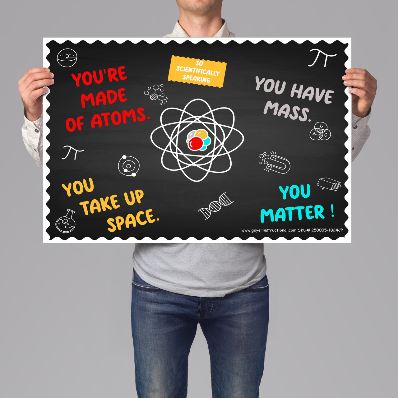 Inspire your students with the You MATTER Science Poster, printed on lightweight yet durable corrugated plastic. This large 24"x36" format makes a bold visual statement in any STEM classroom, hallway, or lab. The witty double meaning reinforces science concepts while promoting self-worth.